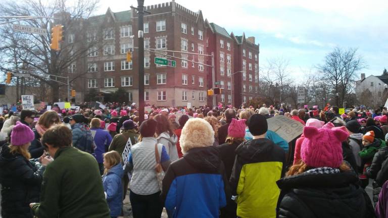MORRISTOWN — New Jersey’s 11th congressional district showed up in full force at the second annual New Jersey Women’s March in Morristown this Saturday, celebrating the anniversary of last year’s historic, nationwide marches by continuing their momentum. This year’s official theme for marches across the United States was “Power to the Polls,” encouraging citizens to exercise their power to vote with a special focus on this November’s primary election. The grassroots political activist group NJ 11th for Change was one of seven event organizers, and its purple hats and badges were scattered liberally through a sea of the knitted pink hats that became a symbol of last year’s marches.